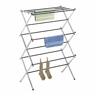 The Whitmor 6060-741 folding clothes drying rack features steel construction with mildew-proof and rust-resistant chrome finish. It has 11 bars that offer great amount of linear drying space. This clothes drying rack folds flat for easy storage and extends to a full 25′ of drying space. It is perfect for hanging delicates, draping denim and laying out woolens.