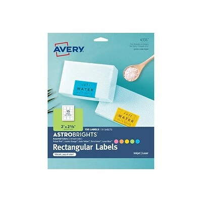 Avery Astrobrights Laser/Inkjet Multipurpose Labels, 2″ x 2 5/8″, Assorted Colors, 15 Labels/Sheet, 10 Sheets/Pack (4331)