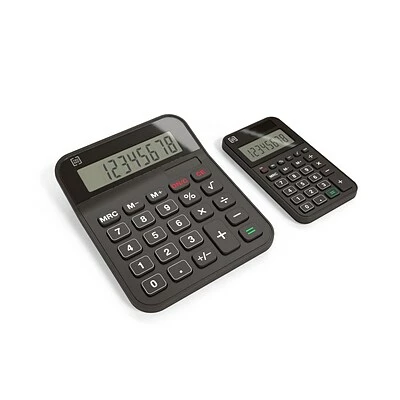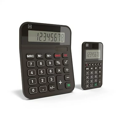 View figures and data clearly when you use this calculator value pack. Pocket-size and desktop calculators provide flexible use options at the office or while on the road. Battery and solar power functionality ensures dependable use any time of day, and the 8-digit LCDs make numbers easy to read. These TRU RED Value Pack calculators feature clearly labeled buttons and dedicated keys for sign change, square root and percentage functions, providing effortless operation.