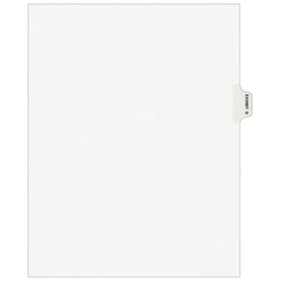 Legal Exhibit Dividers with “Exhibit D” tabs feature heavy-duty unpunched recycled stock that contains 20% post-consumer recycled paper