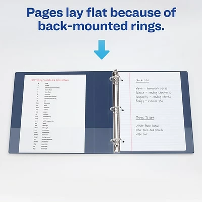 This Heavy-Duty View Binder with One Touch rings is perfect for extended use. From everyday referencing to classroom notes and home business use-this binder’s strong enough to handle them all. The DuraHinge(R) design is stronger, lasts longer and resists tearing, while the DuraEdge(R) feature makes the sides and top more pliable to resist splitting. Our deep texture film offers a smoother finish and features a linen pattern for high quality look and feel. Just pull the lever to open the rings for adding, replacing and removing pages. Then push to lock the rings in place. Even when filled to its 400-page capacity, this binder still has four stacked pockets for a bit of extra space inside. Customize the navy blue cover with free, easy-to-use templates and designs at avery.com/print.