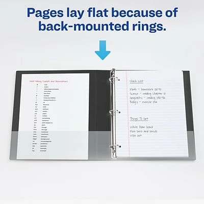 Wide front and back binder panels fully cover standard dividers and sheet protectors