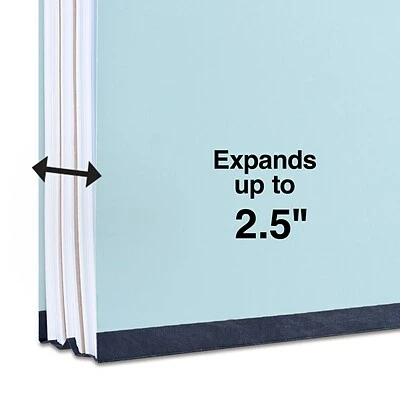 Divide and categorize documents easily with these pressboard classification folders. Embedded fasteners and two partitions let you create a custom filing system for each client or account, and the 2/5-cut tab layout allows for custom labeling. These folders hold legal-size documents to meet a range of business filing needs. With heavyweight construction, these Staples legal-size light blue pressboard classification folders withstand regular use in busy office environments.
