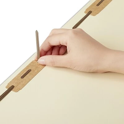 Keep shelf filing systems organized and easily searchable with these fastener folders. The reinforced end tabs offer space for labels and withstand frequent handling, while the durable construction is strong enough for reuse. Embedded fasteners let you divide pages by category or subject for added levels of organization. Designed to accommodate legal-size documents, these Staples manila end-tab fastener folders offer added protection against loss and damage.