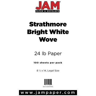 JAM Paper® Bright White Wove Strathmore Legal Paper is an ideal option for printing flawless looking legal documents and more! This pack contains a total of 100 sheets of paper. Each sheet measures 8.5 x 14 inches in size and features a stunning and spotless bright white color! This 24 lb paper is made from high quality materials and is compatible with ink jet and laser printers. Use this paper in your home or office to print legal documents, flyers, invitations, brochures, manuscripts, and other items. Whether it’s for your business, for a special occasion, or for a personal endeavor, this bright white legal paper is there for your paper needs!