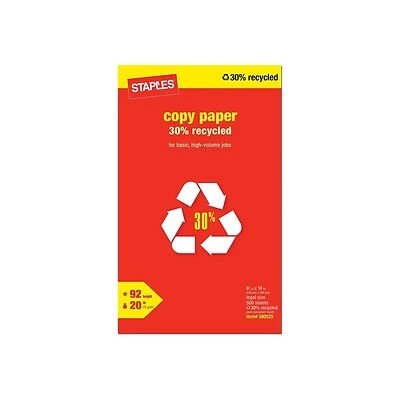 Put everything your business prints on this Staples 30 percent recycled copy paper to show your vendors and clients your commitment to sustainable development. This acid-free paper is made with 30 percent recycled paper pulp, reducing your company’s ecological footprint without sacrificing output.Post-consumer MaterialSwitching to Staples 30 percent recycled copy paper shows your whole workforce that you take conservation seriously. By incorporating a significant fraction of post-consumer material, this paper encourages everyone in the office to follow responsible practices, such as conserving electricity, and acts as part of an overall greener approach to business.Acid-Free ManufactureStaples 30 percent recycled copy paper is manufactured in an acid-free process that reduces point-of-origin waste without sacrificing the high-contrast sheen of the bright white finished product. Acid-free paper resists browning with age, so this paper is fresh and usable even after years on the shelf.Large SupplyThis case of Staples 30 percent recycled copy paper comes bundled as 10 reams of 500 sheets each. That gives your workers 5,000 sheets of paper to run every printer in the office without stopping to restock after every big printing job.