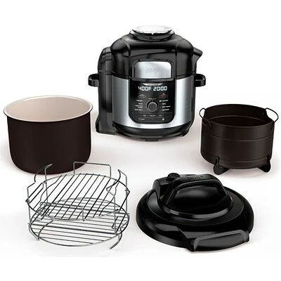 Includes: 1760-watt unit, crisping lid, pressure lid, 8-qt. ceramic-coated pot, 5-qt. ceramic-coated Cook & Crisp Basket, stainless steel Deluxe Reversible Rack, silicone mitts, and 45+ recipe chef-inspired cookbook.