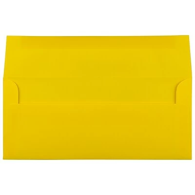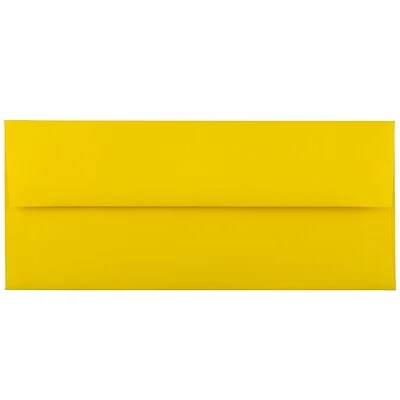 JAM Paper® Brite Hue Yellow Recycled #10 Business Envelopes are made out of smooth, high quality, 24lb, 30% recycled paper. Each one measures 4 1/8 x 9 1/2 inches, the perfect size for three-times-folded standard sized documents. This pack contains an even total of 50 envelopes. Each one has a straight flap opening and a reliable gum closure to keep the contents placed inside secure as they are transported through the mail! Certain to stand out in any environment and to get the immediate attention of every mail recipient, these envelopes feature a bright and vibrant lemon yellow color! Use these envelopes for business and promotional mailings, special occasion mailings, and more!