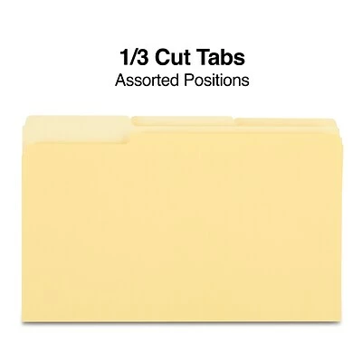 Gather office documents inside these file folders. The yellow hue lets you color-code paperwork for quick reference, and the 1/3-cut tab layout allows for custom labeling. The durable paper construction withstands frequent handling, making these folders conveniently reusable. With thoughtful sizing, these Staples legal-size yellow three-tab file folders accept legal-size pages to meet a range of paperwork storage needs.