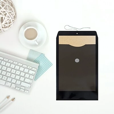 JAM Paper® Black Legal Open End Plastic Envelopes with Button and String Tie Closures are the ideal storage and carrying unit for all of your important or private documents. Made of pliable yet durable plastic, this envelope will protect your documents from scratches, bends, and dents! Each one has a two button string tie closure to keep your papers secure. They provide 9 3/4 x 14 1/2 inches of storage space for standard to large sized documents, and a jet black color which will ensure that your documents cannot be seen from the outside! If you’re transporting or storing any of your important documents, don’t take the risk that they will get damage or lost. Instead, keep them safe, sound, and organized with this black envelope! This pack includes 108 envelopes.