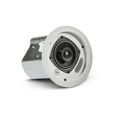 These full-range ceiling speakers consist of a 4” (100mm) high-tech cone driver and a 19mm soft-dome, liquid-cooled tweeter mounted in a vented, paintable baffle made of UV-resistant UL94-V0 and UL94-5HB material, with a pre-attached blind-mount backcan for quick and easy installation. The pair of white Professional Series Control 14C/T Two-Way 4″ Coaxial Ceiling Loudspeakers from JBL is designed to provide enhanced sound quality for a wide variety of medium volume applications such as music cafes, business music systems, retail stores, music/paging systems, airports, reception/waiting rooms, lounges, courtrooms, convention centers, hotels, educational facilities, and more.