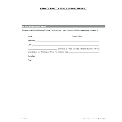 Documents the patient’s acknowledgement that they have received and reviewed the Notice of Privacy Practices (#28998). One page; 8-1/2×11″.