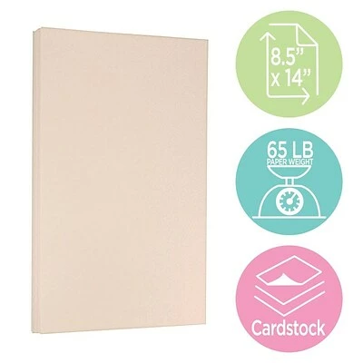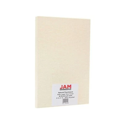 Natural in every sense of the word, this natural colored JAM Paper Parchment Legal Size Cardstock is made of 30% recycled post consumer content and has a shade of off-white that makes it perfect for any occasion. This 65lb paper cardstock is thick and wonderful and great for invitations, notes, letters, arts and crafts, business mailings, promotional and marketing materials and more! The parchment finish has a mottled, or dappled look to it, making it look authentic. It is a standard legal size so it measures 8.5 x 14 inches and it is sold in packs of 50. Size: 8.5 x 14 inches | Color: Natural | Quantity: 50/pack