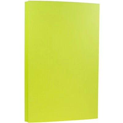 Brighten up anyone’s day (including your own!) with this JAM Paper® Bright Colored Legal Cardstock! This cardstock surely lives up to its name. It is bright and bold and is a brite hue ultra lime green color. This shocking shade of yellow green is sure to catch eyes. It is made of 65lb paper, so not only will it be remembered for it’s color, it will also be remembered for the quality that can be felt. It has a smooth finish, which makes writing and printing easy. This cardstock is a legal size, meaning it measures 8.5 x 14 inches. It can be used for virtually any paper need. Try using it for your next DIY invitations, cards, letters, notes, business mailings, promotional flyers, posters, arts and crafts and more! This cardstock is sold in packs of 50.