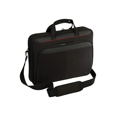 Protect your laptop and other office devices in this Targus Classic TCT027US topload laptop case. This attractive black polyester carrying case features a slim, lightweight design that doesn’t add bulk and is easy to transport. The main compartment fits a 16-inch laptop, and the other compartments can hold your files and accessories. The case features both carrying handles and a removable padded shoulder strap for your comfort.
