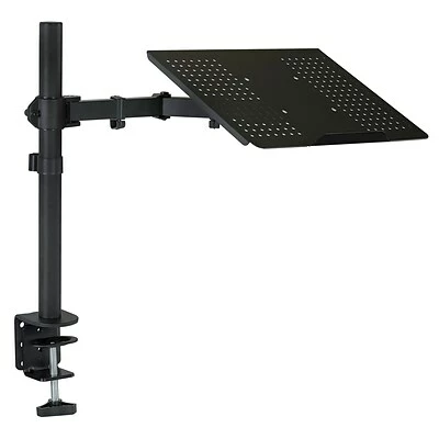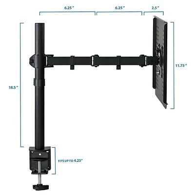 Universal office PC riser with a large vented tray works with Sony, HP, Asus, Apple MacBook, Acer, Toshiba, Chromebook, Netbook and gaming notebooks. Supports up to one 17″ portable computer with its platform size of 14″ x 11.8″. The bottom portion of the platform has a lip to securely hold the laptop in place.The mount assembly is full-motion. The arm holding the laptop tray can be moved up and down on the vertical pole. The pole measures 17.7″ from the desk surface. Dual folding arms have three joints that allows the tray to swivel/articulate left to right and towards or away from the user. The tilt angle of the tray can also be adjusted.
