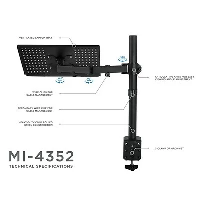 MI-4352LT notebook stand allows you to lift the laptop up from your desk surface for a sit-stand and standing workstation set up or to raise the laptop screen to an ergonomic height. Optimal placement of the screen may help reduce eye, neck and back pain. Use it with a separate monitor desk stand or wall mount, or with our dual laptop/monitor stand (MI-4352LTMN) to increase display size and quantity.