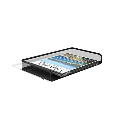 Keep frequently used files at your fingertips by using this side-load letter tray to clear away clutter from your desk. A solid metal bed provides a stable base for folders and documents to rest, and reinforced mesh construction supports heavy files. This TRU RED™ side-load matte black mesh letter tray features flat square-rounded edges for a sleek look on your desktop.