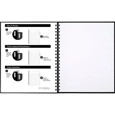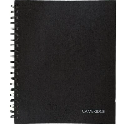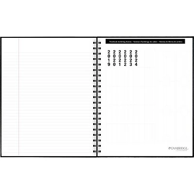 Handle everyday note-taking needs with this hardbound spiral business notebook. Each page is legal-ruled to let you write with large letters for strong readability, while the black paper-based linen cover provides durability and a sleek appearance. This Cambridge hardbound business notebook features a poly pocket for quick access to small accessories and loose pages, while the label page offers customization options.