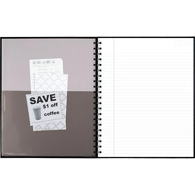 Poly pocket stores loose sheets. Label page is included to customize the notebook. High quality paper contains a minimum of 30% post-consumer waste recycled material