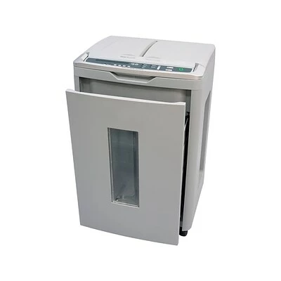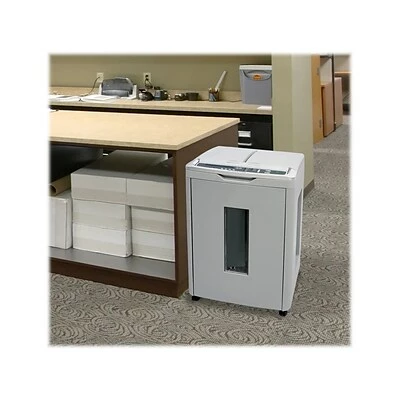 Shreds credit cards, standard staples, CDs, DVDs, and paper up to 350 sheets at 12.5′ per minute