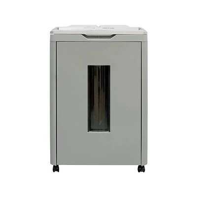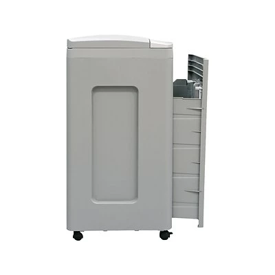 Shreds credit cards, standard staples, CDs, DVDs, and paper up to 700 sheets at 19.7′ per minute