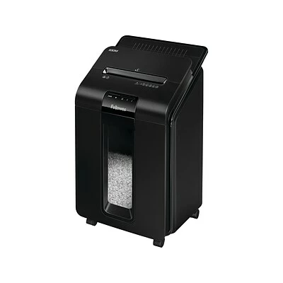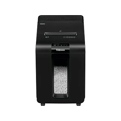 With FlexShred capability AutoMax 100M shreds up to 100 sheets automatically or 10 sheets manually. Micro-cut P-4 security level provides superior protection with shreds 6x smaller than standard cross-cut. Also shreds credit cards, paper clips and staples (manual feed only). Auto Reverse stops and reverses paper if a jam occurs, and SilentShred offers ultra-quiet performance for shared workspaces. Sleep Mode shuts down the AutoMax 100M shredder after 2 minutes of inactivity to save energy, and spacious 6-gallon pull-out bin eliminates the need for frequent emptying.