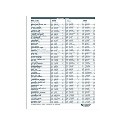 This monthly House of Doolittle monthly planner has ample space in the daily blocks for appointments and reminders. Offers previous and next month’s references on each two-page spread. There is also an additional page with important holiday dates for three years in list form. A three-year calendar reference page is great for long-range planning. Weeks are numbered to fit the need of every office application. Note space for future planning per month will keep you organized. Provides Julian dates and days remaining for quick reference.