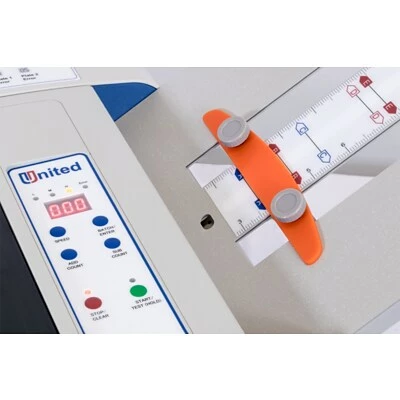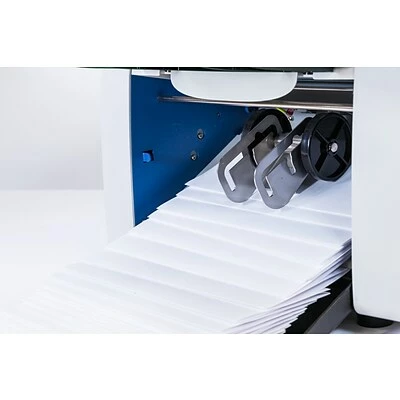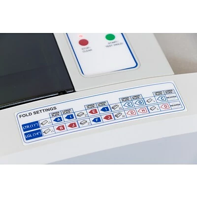 The United F100 Document Folder is an ideal solution for low-volume folding projects. This compact unit processes up to 7,400 sheets per hour in 11″ and 14″ paper sizes. It’s clearly marked for four common fold settings. The LCD control panel features a resettable 3-digit counter and batch setting to process a specific number of sheets, for easy unloading. The output conveyer includes easily adjustable stacker wheels for neat, sequential stacking of folded pieces.