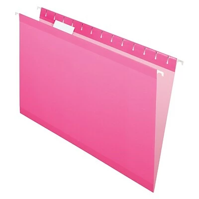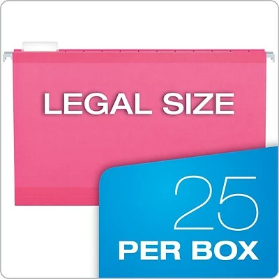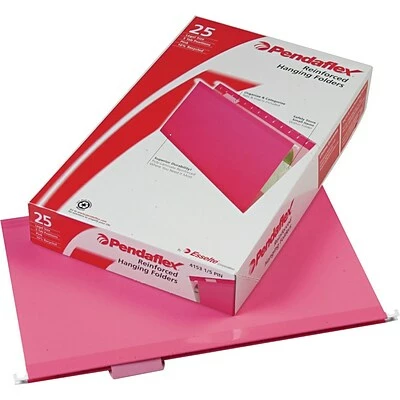 Pendaflex Reinforced Hanging Folders feature poly laminate strips across top edge and bottom fold to prevent tears and rips. The lighter interior prevents misfiles. Includes an 8.5″ x 11″ printer-ready label sheet and 25 clear tabs for placement in 5 positions so you can customize your files. Paper made from 10% recycled fiber with 10% post-consumer fiber. Legal size, pink. 25 Per box.