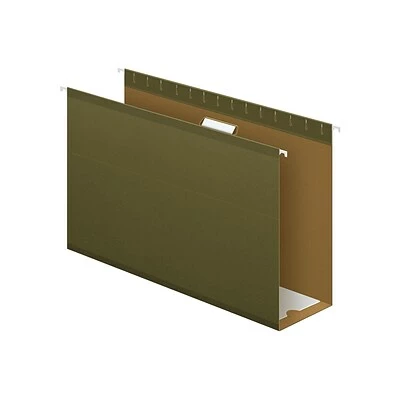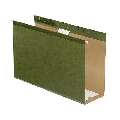 Store stacks of papers up to 4-inch thick with these four extra-capacity hanging pockets. The 11-point cover material keeps items inside protected, and the standard-green color looks professional. Strong rods with longer plastic hooks and built-in tension springs ensure these Pendaflex legal-size hanging folders easily slide and stay on track in your file cabinet.