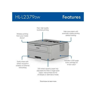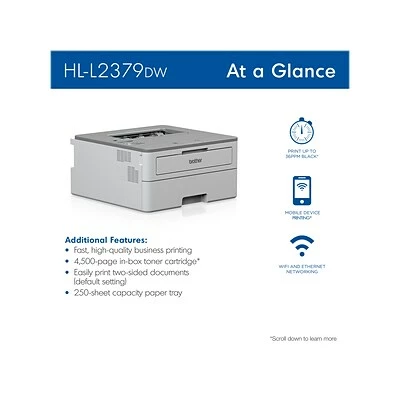 The Brother HL-L2379DW compact monochrome laser printer provides the functionality you need for environments with limited space, including corporate home offices and small offices. This compact and reliable printer helps increase productivity with fast print speeds up to 36 ppm and default automatic duplex (two-sided) printing to help save paper. Offers in-box value with the ability to print up to 4500 pages using the included Brother genuine super high-yield toner cartridge. Equipped with a 250-sheet capacity paper tray that is adjustable for letter- or legal-size paper, so you can spend less time refilling paper trays. The HL-L2379DW also features built-in wireless or Ethernet network interfaces to easily set up and share on your wireless or wired network. Wirelessly print from your desktop, laptop, smartphone, or tablet: perfect for today’s remote workforce.