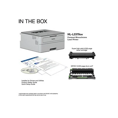 Package includes: Brother HL-L2379DW, super high-yield toner cartridge (4500 pages), DR730 drum (12000 pages), quick setup guide, installation CD-ROM (macOS available via download)