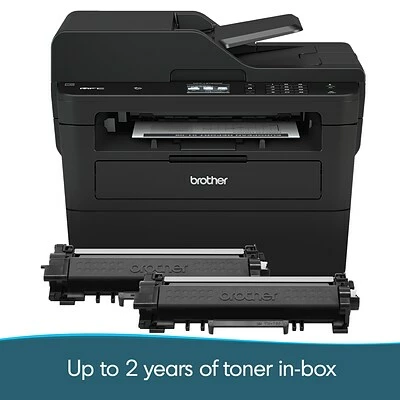 The Brother MFC-L2750DW XL Extended Print monochrome laser printer comes with up to 2 years of toner in-box. Eliminate the empty toner cartridge panic during important print jobs with approximately 7,500 pages included. The up to 50-sheet automatic document feeder helps save time with single-pass duplex (2-sided) copying and scanning, while offering multi-page copy, scan & fax. Its class leading print speeds of up to 36 pages per minute provide increased efficiency. Wireless mobile device printing and “touch to connect” printing and scanning with NFC deliver added convenience. You can print-from and scan-to popular Cloud services directly from the 2.7” color touchscreen and help save time by creating custom shortcuts for your most used features. Comes with a 2-year limited warranty and free online, call, or live chat support for the life of your printer.