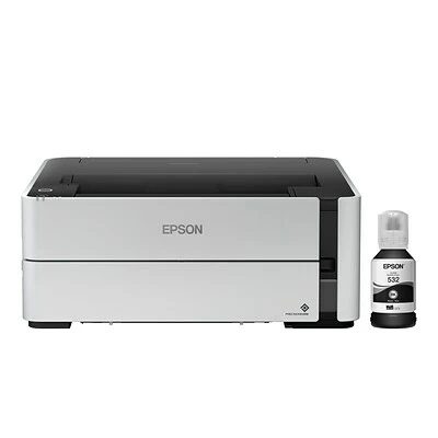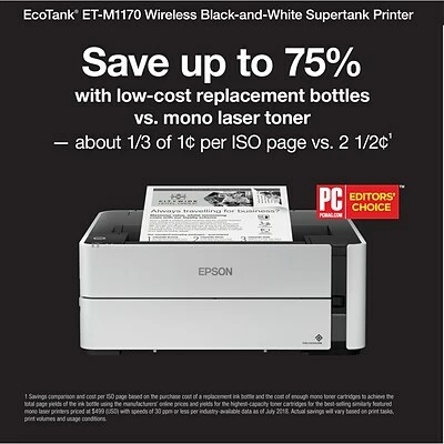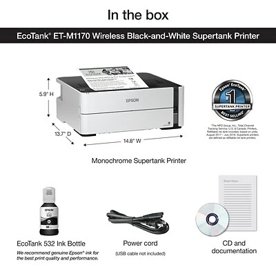 Enjoy the benefits of mobile printing and big savings with this durable EcoTank with refillable ink tank. A cost-efficient solution, print up to 11,000 pages with the included black ink. It’s fast and energy efficient as there’s no warm up time. Use your time and resources more effectively with Wi-Fi, double-sided printing, 250-sheet tray and PrecisionCore printhead.