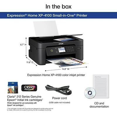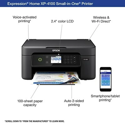 The sleek Epson® Expression XP-4100 wireless all-in-one offers auto 2-sided printing and other high performance features for efficient everyday home printing. Featuring a 2.4″ color LCD for simple setup and navigation, the XP-4100 makes it easy to wirelessly print, copy, and scan documents and photos. Print from your iPad®, iPhone®, Android™ tablet or smartphone1. Affordable individual ink cartridges mean you only replace the color that runs out. And, hands-free voice-activated functionality2 allows for easy printing, on command. Get truly touchable photos and documents with instant-dry ink ? all from a compact printer with a convenient space-saving design.