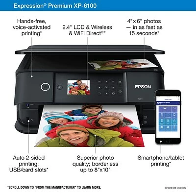 Forget compromise – with the XP-6100 you can produce high-quality photos and text documents from a compact and stylish all-in-one. Unsightly tech is a thing of the past: this all-in-one looks great from every angle. Also, wherever you chose to place it, the modest footprint ensures it takes up as little space as possible. You can save time and paper too with the dual paper trays and fast, A4 double-sided printing. It’s also possible to print on suitable CDs and DVDs.