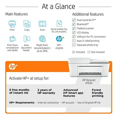 The HP DeskJet 4155e has the essential features you need to print basic color documents like recipes and forms. Print, copy and scan with ease, print from your phone, mobile fax and get easy setup. It includes the optional HP+ Smart Printing System that keeps itself up to date and ready to print from virtually anywhere at any time—at no additional cost.