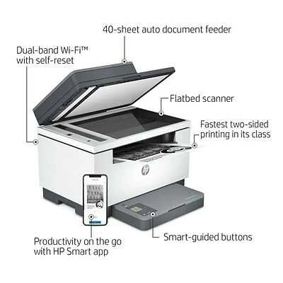 HP LaserJet MFP M234sdw high-productivity multifunction printer with the fastest two-sided printing in its class, an automatic feeder, and the time-saving HP Smart app. Count on peace of mind from more reliable connections, and a worry-free experience with simplified setup. Dynamic security enabled printer. Contains technology that may prevent cartridges with non-HP chips or circuitry from working now or in the future.