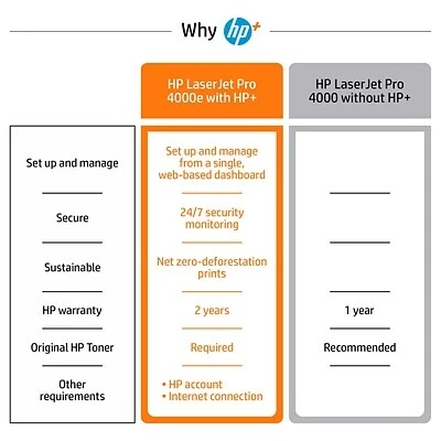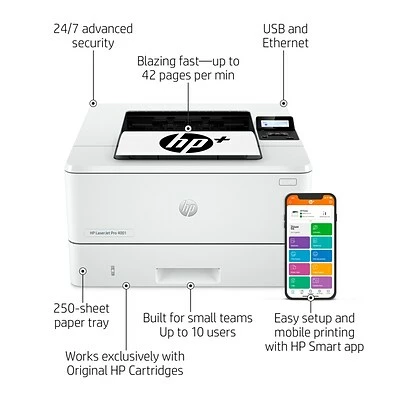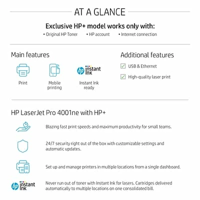 Get ultra-fast speeds and powerful productivity with the LaserJet Pro 4001ne with HP+ included at no additional cost. Get laser quality black & white printing for all your business documents. Includes HP+ smart office features so you can set up and manage printers in multiple locations with a single dashboard. Never run out of toner with an optional subscription for Instant Ink for lasers.