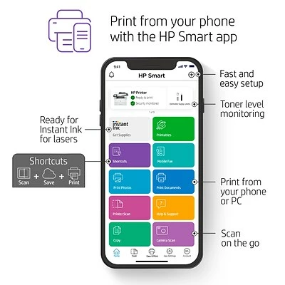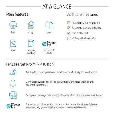 Get ultra-fast speeds and maximum productivity with the multifunction LaserJet Pro 4101fdn. Get laser quality black & white printing for all your business documents. Support your dynamic workteam with this high-speed smart printer, ideal for up to 10 users. Never run out of toner with an optional subscription for Instant Ink for lasers.
