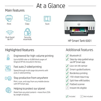The HP Smart Tank 6001 makes printing seamless from start to finish for the whole family with a high-capacity ink tank and wireless connectivity. Create outstanding-quality color documents at a low cost with up to two years of Original HP Ink included in the box.