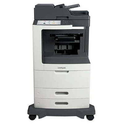 The Lexmark MX811dfe MFP with a customizable e-Task touch screen, staple finisher, 1,200-sheet standard input, 1GB of standard memory and 160+GB hard disk provides print, copy, fax, email and scan functions.