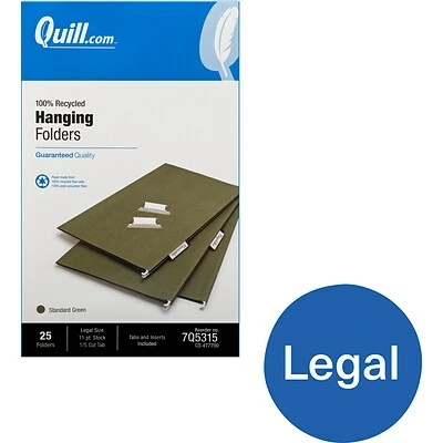 Store several boxes of these Quill Brand standard hanging file folders in your supply closet to organize your filing cabinets and protect folders that aren’t in use. Made from 100 percent recycled content, these hanging file folders make it a snap for your company lower its carbon footprint and help protect the environment. Keep a copy of important contracts or legal briefs in these legal-size hanging file folders.