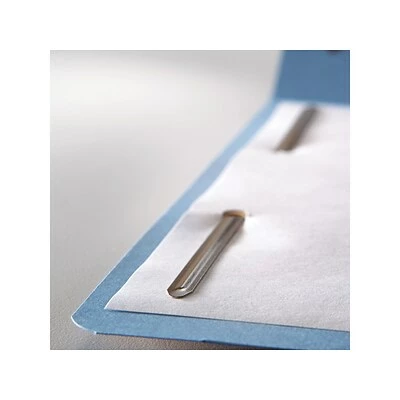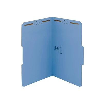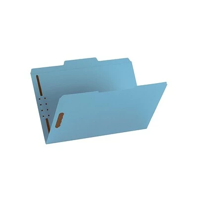 Find important paperwork quickly when you store documents in these legal-size file folders. Two filing surfaces with embedded fasteners keep pages securely in place, while the reinforced tabs stand up to frequent handling. The 1/3-cut assorted-position tab layout ensures labels remain easy to see. With a bright blue hue, these Smead two-fastener folders make it easy to color-code important papers.