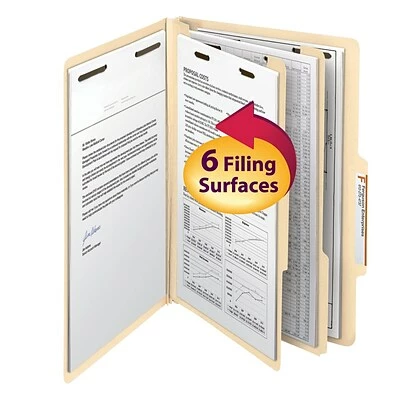 Utilize the convenience of multiple filing surfaces with these manila classification file folders. Each one features two dividers and two fasteners on the front and back panels to provide a total of six filing surfaces for organizing and subdividing files. These Smead classification file folders are crafted with 18-point manila stock for durability and are scored for 2-inch expansion to hold large documents.