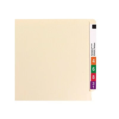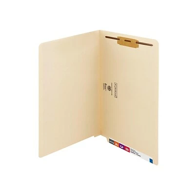 Archive charts, forms and other documents with these legal-size manila fastener file folders. The straight-cut tabs offer ample space for writing or applying labels, while the 11-point manila stock protects contents from dirt, spills and damage. These Smead Shelf-Master manila end-tab file folders come in a pack of 50 units and feature embedded fasteners to hold papers securely.