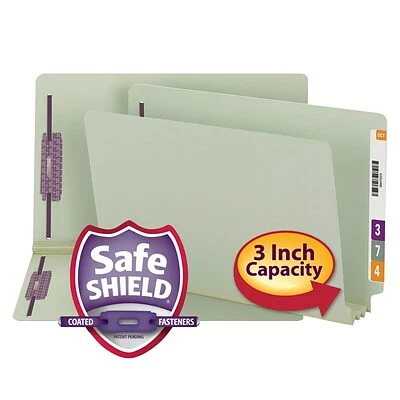 Store and organize your files and reports with these Smead pressboard fastener folders. SafeSHIELD fasteners help subdivide files into various categories and keep documents secure, while a 3-inch expandable file gusset provides plenty of space for even large stacks of paperwork. These Smead pressboard fastener folders are made from sturdy 25-point pressboard to keep important documents safe.