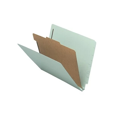 Organize documents for filing with these Smead legal-size pressboard classification folders. The end-tab design is ideal for use with shelf filing systems, providing ample room for color-coded labels. A single divider provides additional categorization options, while the SafeSHIELD coated fasteners keep pages secure without rips or tears. These Smead legal-size pressboard classification folders come in a subdued gray/green hue for a professional appearance.