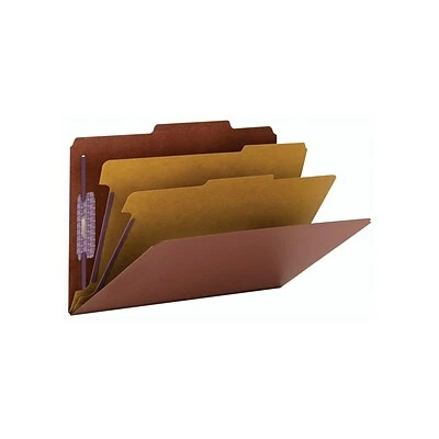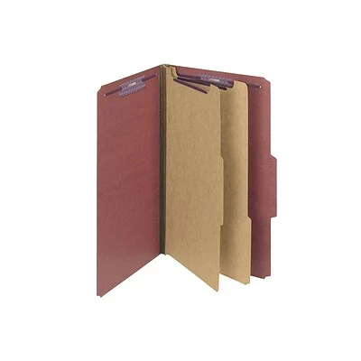 Categorize documents or subdivide large files with these red classification folders. Fasteners with SafeSHIELD coated technology prevent torn paper or finger cuts while expanding usable filing surfaces, and two dividers create sections for sorting papers or drafts. The sturdy 25-point pressboard covers of these Smead classification folders protect interior pages and withstand frequent use.